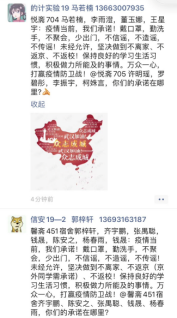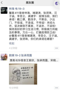 诺不停学,开展朋友圈战“疫”承诺传递。以宿舍为单位开展微信朋友圈公开承诺传递,如悦斋704宿舍马若楠、李雨澄、董玉娜,王星宇:疫情当前,我们承诺!戴口罩,勤洗手,不聚会,少出门,不信谣,不造谣,不传谣!未经允许,坚决做到不离家、不返京、不返校!保持良好的学习生活习惯,积极做力所能及的事情。万众一心,打赢疫情防卫战!@悦斋705宿舍你们的承诺在哪里?据悉,2019级100多个学生宿舍全部参与线上公开承诺活动。